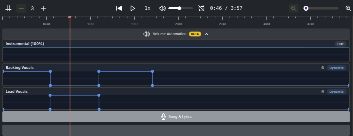 You can now adjust the volume of the Instrumental, Backing Vocals, and Lead Vocals tracks independently at any point in the timeline. Create smooth fade-ins, fade-outs, drop the vocals during a solo, or boost the instrumental for dramatic effect — all with a few clicks.