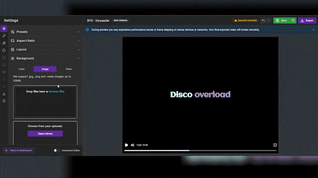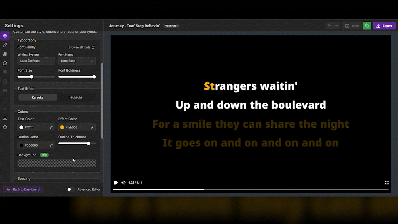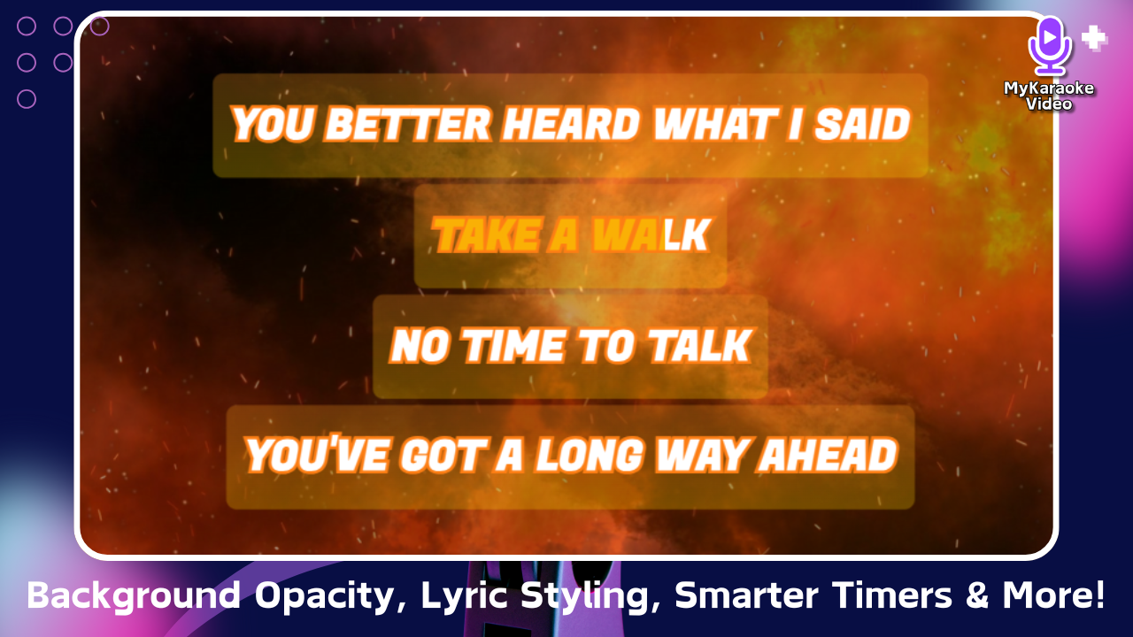 Your lyrics deserve their own stage! Add custom background colors or pre-set gradients behind your lyrics, and fine-tune their transparency with opacity controls specifically for these lyric backgrounds. It’s all about enhancing readability and personalizing your text like never before!